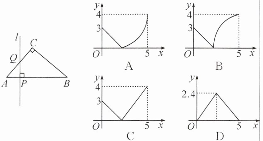 1. 如图,在$Rt\triangle ABC$中,$\angle C = 90^{\circ}$,$AC = 3$,$BC = 4$,直线$l\perp AB$,将直线$l$沿$AB$方向从点$A$平移到点$B$,直线$l$交$AB$于点$P$,交$AC$(或$BC$)于点$Q$。设$AP = x$,$CQ = y$,则下列图象中,能表示$y$关于$x$的函数关系的是(