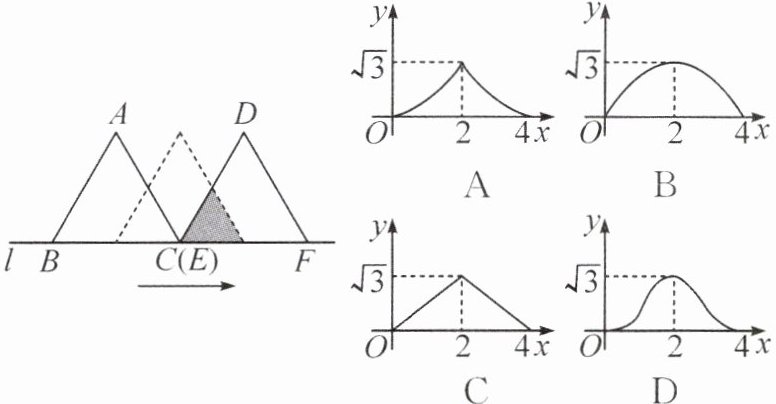 2. (2020·安徽T10·4分)如图,$\triangle ABC$和$\triangle DEF$都是边长为$2$的等边三角形,它们的边$BC$,$EF$在同一条直线$l$上,点$C$,$E$重合。现将$\triangle ABC$沿着直线$l$向右移动,直至点$B$与点$F$重合时停止移动。在此过程中,设点$C$移动的距离为$x$,两个三角形重叠部分的面积为$y$,则$y$随$x$变化的函数图象大致为(