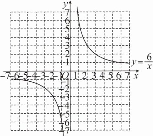 (2)在图中画出正比例函数 $ y = kx $ 的图象,并根据图象,写出与正比例函数值大于反比例函数值时,$ x $ 的取值范围。