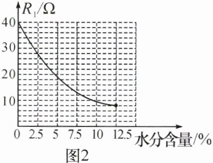 8. (2024·合肥38中三模)粮食的水分含量是评价粮食品质的重要指标,粮食水分检测对粮食的收购、运输、储存等都具有十分重要的意义。其中,电阻式粮食水分测量仪的内部电路如图1所示,将粮食放在湿敏电阻 $ R_1 $ 上,使 $ R_1 $ 的阻值发生变化,其阻值随粮食水分含量的变化关系如图2所示。观察图象,下列说法不正确的是(