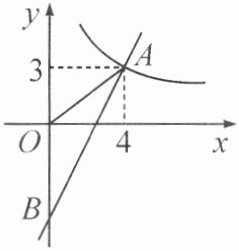 (2016·安徽T20·10分)如图,一次函数 $ y = kx + b $ 的图象分别与反比例函数 $ y = \frac{a}{x} $ 的图象在第一象限交于点 $ A(4, 3) $,与 $ y $ 轴的负半轴交于点 $ B $,且 $ OA = OB $。
