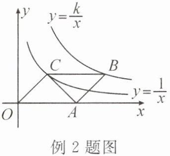 (2022·安徽T13·5分)如图,$ □ OABC $ 的顶点 $ O $ 是坐标原点,点 $ A $ 在 $ x $ 轴的正半轴上,点 $ B $,$ C $ 在第一象限,反比例函数 $ y = \frac{1}{x} $ 的图象经过点 $ C $,$ y = \frac{k}{x} $($ k \neq 0 $)的图象经过点 $ B $。若 $ OC = AC $,则 $ k = $