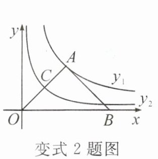如图,已知等腰直角三角形 $ OAB $ 的顶点 $ O $ 是坐标原点,$ \angle OAB = 90° $,点 $ B $ 在 $ x $ 轴的正半轴上,点 $ A $ 在第一象限,反比例函数 $ y_1 = \frac{4}{x} $($ x > 0 $)的图象经过点 $ A $,反比例函数 $ y_2 = \frac{k}{x} $($ x > 0 $)的图象经过 $ OA $ 的中点 $ C $,则 $ k = $