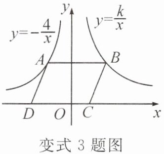 (沪科9上P48练习T3变式)如图,面积为 10 的 $ □ ABCD $ 的边 $ CD $ 在 $ x $ 轴上,反比例函数 $ y = -\frac{4}{x} $($ x < 0 $)和 $ y = \frac{k}{x} $($ k > 0 $,$ x > 0 $)的图象分别过平行四边形 $ ABCD $ 的顶点 $ A $ 和顶点 $ B $,则 $ k $ 的值为