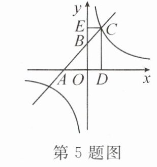5. (2020·安徽T13·5分)如图,一次函数 $ y = x + k $($ k > 0 $)的图象与 $ x $ 轴和 $ y $ 轴分别交于点 $ A $ 和点 $ B $,与反比例函数 $ y = \frac{k}{x} $ 的图象在第一象限交于点 $ C $,$ CD \perp x $ 轴,$ CE \perp y $ 轴,垂足分别为 $ D $,$ E $。当矩形 $ ODCE $ 与 $ \triangle OAB $ 的面积相等时,$ k $ 的值为