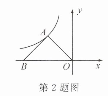 2. 如图,等腰直角三角形 $ OAB $ 的斜边 $ OB $ 在 $ x $ 轴的负半轴上,顶点 $ A $ 在反比例函数 $ y = \frac{k}{x} $($ x < 0 $)的图象上,$ \triangle OAB $ 的面积为 4,则 $ k $ 的值为(