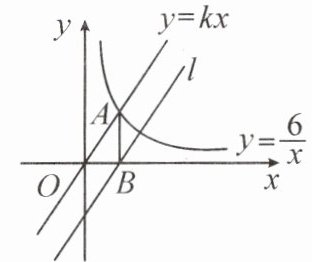 4. (2018·安徽T13·5分)如图,正比例函数 $ y = kx $ 与反比例函数 $ y = \frac{6}{x} $ 的图象有一个交点 $ A(2, m) $,$ AB \perp x $ 轴于点 $ B $。平移直线 $ y = kx $,使其经过点 $ B $,得到直线 $ l $,则直线 $ l $ 对应的函数解析式是