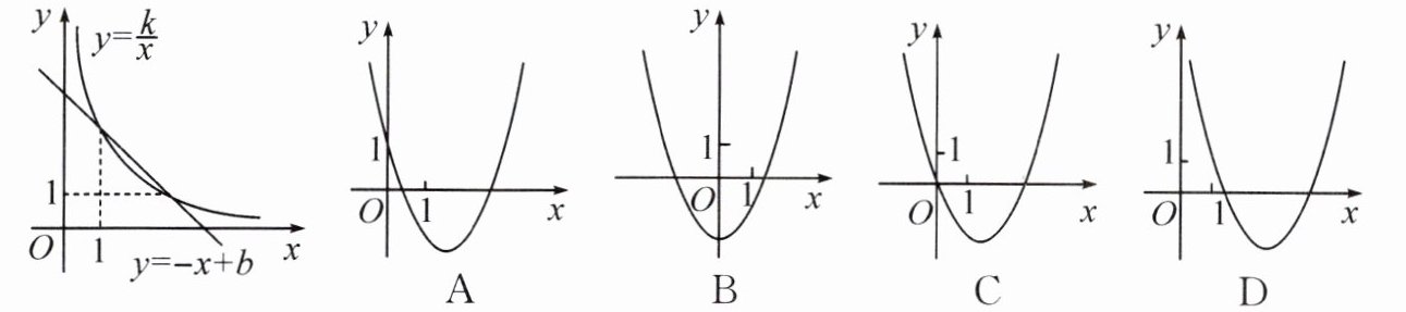 (2023·安徽 T9·4 分)已知反比例函数 $ y = \frac{k}{x} $($ k \neq 0 $)在第一象限的图象与一次函数 $ y = -x + b $ 的图象如图所示,则函数 $ y = x^2 - bx + k - 1 $ 的图象可能为()