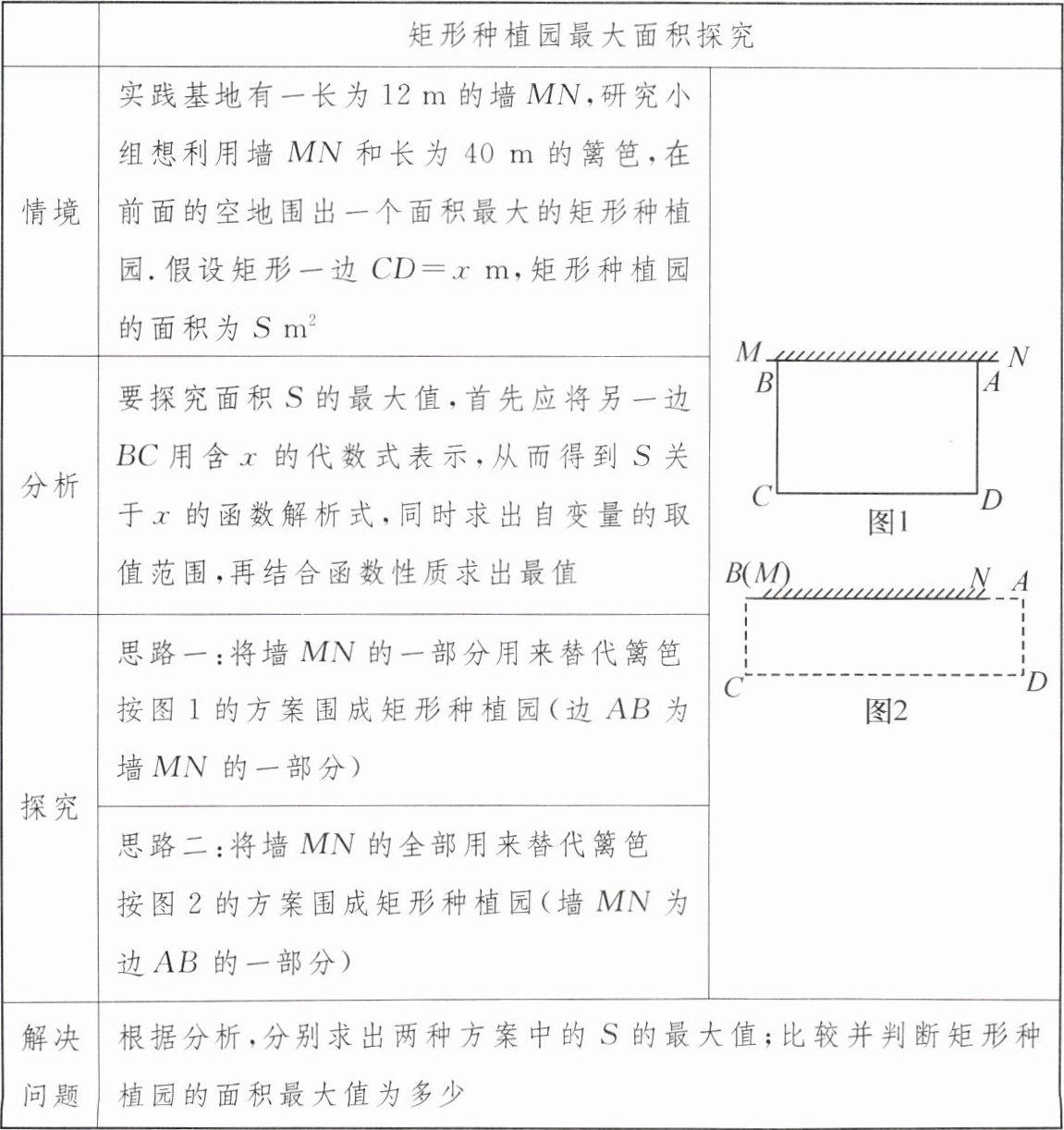 解:设矩形菜园的宽为$x$m,则长为m,根据墙长为18m,可得$x$的取值范围为,菜园的面积$S=$m²。把解析式化成$S=a(x - h)^2 +k$的形式:,∴当$x=$m时,矩形菜园的面积$S$最大,最大值为m²。