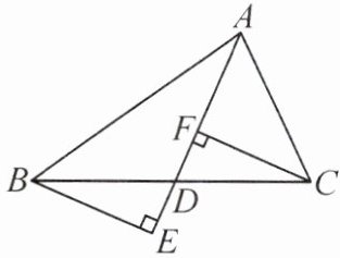 (沪科8上P115复习题A组T10变式)如图,已知$AD$为$\triangle ABC$的中线,分别过点$B$,$C$作射线$AD$的垂线,垂足分别为$E$,$F$。
