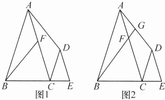 5. (2024·滁州天长市模拟)如图1,$C$ 为线段 $BE$ 上一点,分别以 $BC,EC$ 为底,在 $BE$ 的同侧作等腰三角形 $ABC$ 和等腰三角形 $DCE$,且 $\angle ABC=\angle DCE$,在线段 $AC$ 上取一点 $F$,使得 $AF = DC$,连接 $BF,AD$。