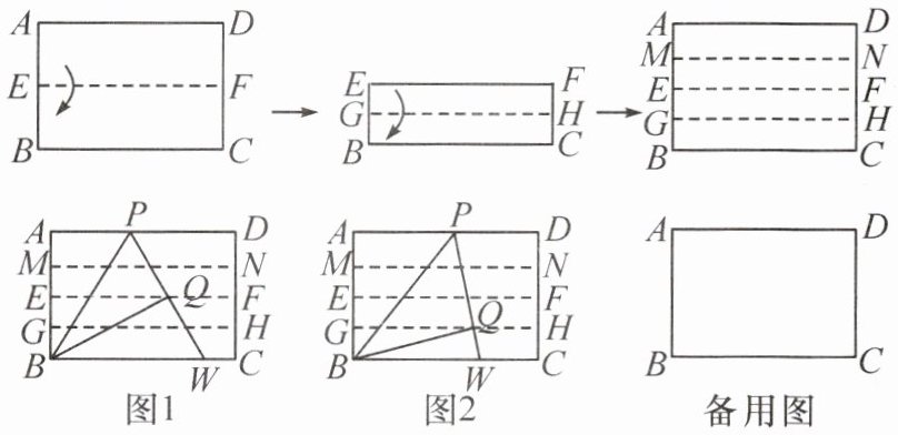 5. 如图,对折矩形纸片$ABCD$,使$AD$与$BC$重合,折痕为$EF$;再一次对折纸片,使$EF$与$BC$重合,折痕为$GH$;把纸片展平,$MN$也为折痕;$P$为线段$AD$上一点,再次沿$BP$折叠矩形纸片,使点$A$落在原矩形所在平面的点$Q$处。