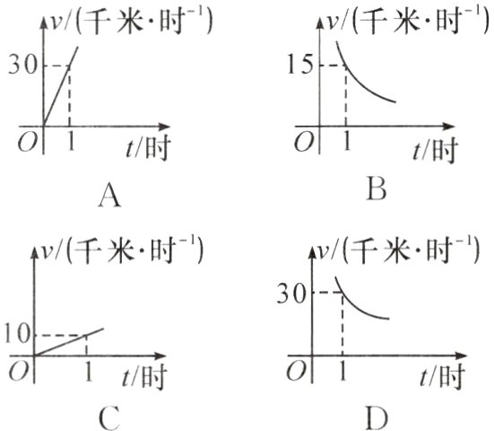 2.已知甲、乙两地相距30千米,汽车从甲地匀速行驶到乙地,则汽车行驶速度v(千米/时)关于行驶时间t(时)的函数图象为 ( )