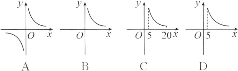 7.某学校要种植一块面积为100$m^2$的长方形草坪,要求两边长均不小于5m,则草坪的一边长y(m)随另一边长x(m)的变化而变化的图象可能是 ( )