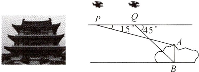 ∴PC = PQ + CQ = 425 m. 在Rt△PCA中,$\tan\angle APC=\tan15^{\circ}=\frac{AC}{PC}=\frac{AC}{425}\approx0.27$,