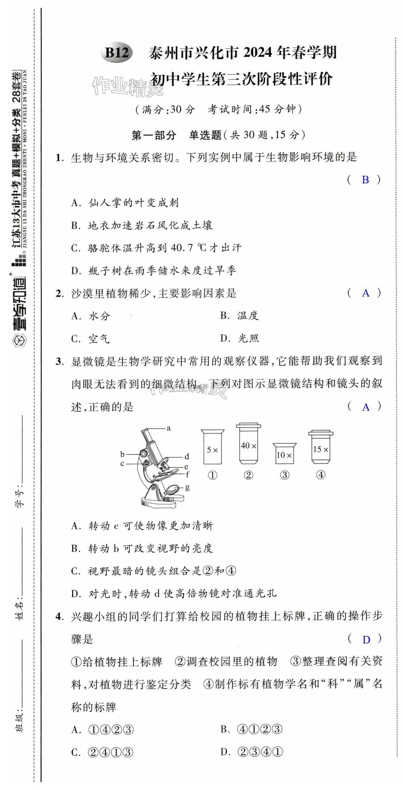 注:目前有些书本章节名称可能整理的还不是很完善,但都是按照顺序排列的,请同学们按照顺序仔细查找。练习册 2025年江苏13大市中考28套卷中考生物 答案主要是用来给同学们做完题方便对答案用的,请勿直接抄袭。