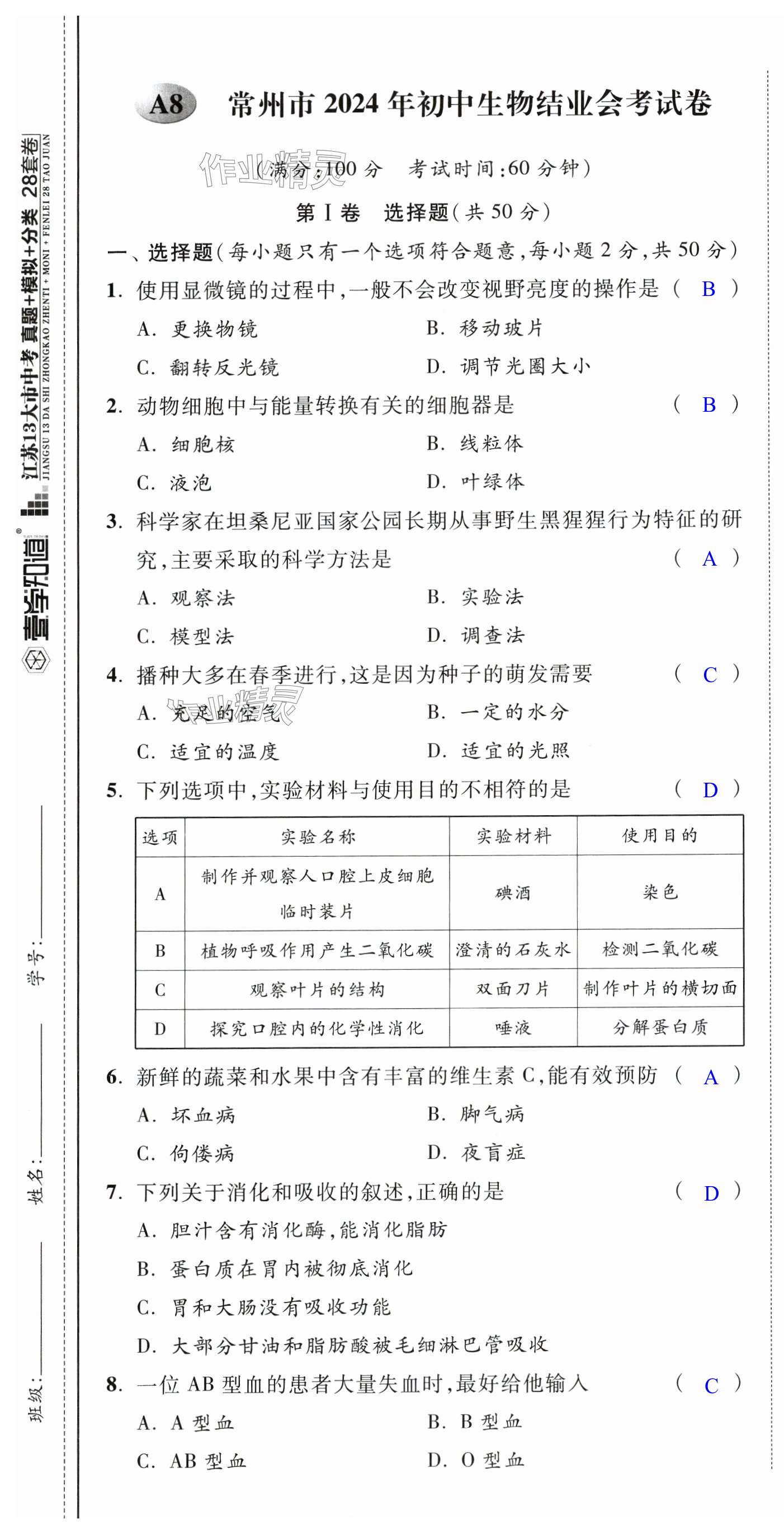 注:目前有些书本章节名称可能整理的还不是很完善,但都是按照顺序排列的,请同学们按照顺序仔细查找。练习册 2025年江苏13大市中考28套卷中考生物 答案主要是用来给同学们做完题方便对答案用的,请勿直接抄袭。