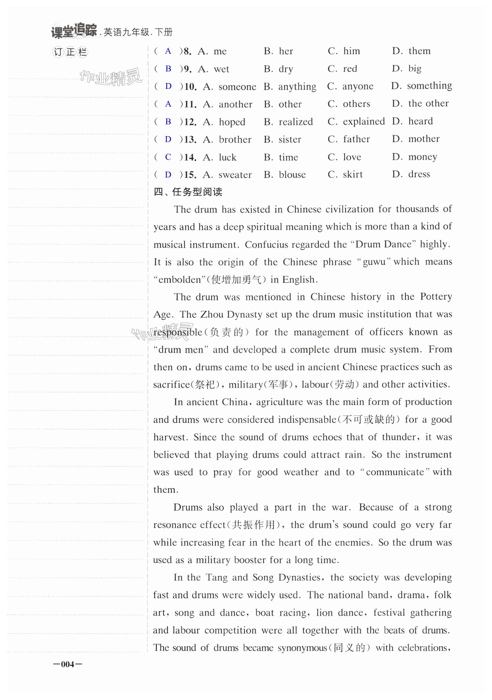 注:目前有些书本章节名称可能整理的还不是很完善,但都是按照顺序排列的,请同学们按照顺序仔细查找。练习册 2025年课堂追踪九年级英语下册译林版 答案主要是用来给同学们做完题方便对答案用的,请勿直接抄袭。