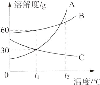 A. 将$t_2$℃时A的饱和溶液降到$t_1$℃,可析出A固体