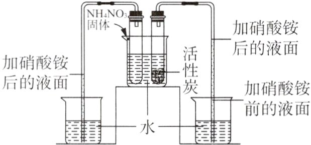 20. 用如图所示的装置研究“活性炭吸附能力与温度变化的关系”。将NH₄NO₃固体加入水中搅拌,观察到两侧玻璃管中的液面上升的高度不同。
