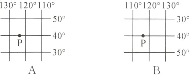 7. 下列四幅经纬网图中,P点表示北京。P点位置表示正确的是( )