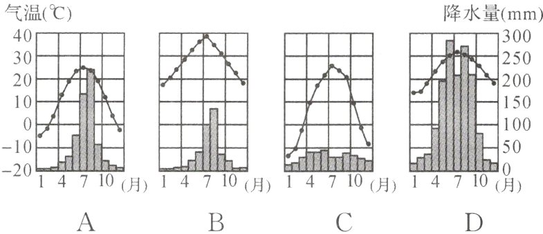 14. 下列气温曲线与降水量柱状图中,与香港气候相符的是( )