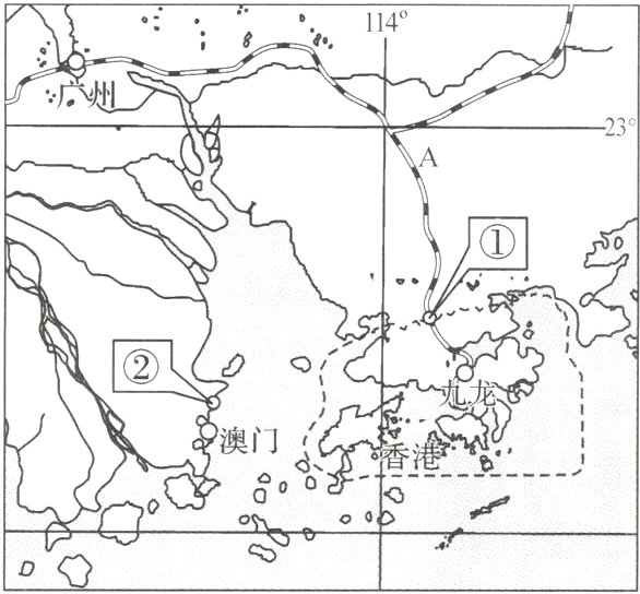 (2)香港北部与①______经济特区相连,有广深铁路和A______铁路通往内地,澳门与②______经济特区毗邻。