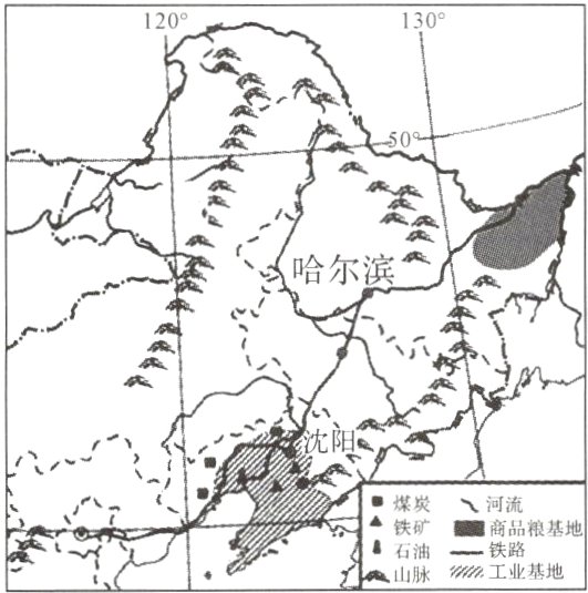 (2023·营口)东北三省是中华人民共和国成立后建成的第一个重工业基地,是“新中国工业的摇篮”。读图,完成6~7题。