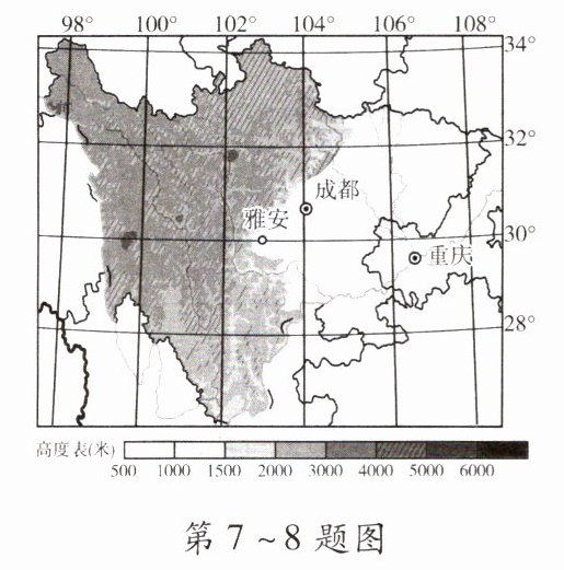 7.C 解析:四川雅安市及周边地区地处四川盆地西部边缘,多云雾天气,不适合开发太阳能。盆地地形,风力较小,不适合开发风能。雅安市及周边地区属于亚热带季风气候,降水丰富,地势落差较大,水能资源丰富,适合重点开发,雅安市的水电站总发电量居全省第一位。该地地热能不丰富,不适合重点开发。