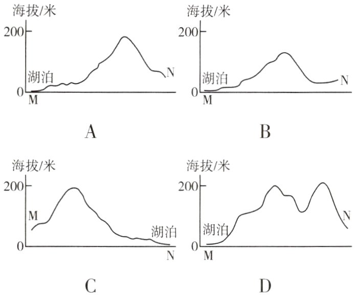 10.A 解析:读图可知,沿MN线绘制的地形剖面示意图,M地位于湖泊,海拔低于N,等高距为20米,N处海拔在40~60米之间,MN一线穿越该地区海拔最高的山峰(180~200米),故该地形剖面图是中间高,左侧最低,右侧较高。B图中间的海拔远低于200米。C图M处海拔高于N。D图出现两个200米左右的山峰。