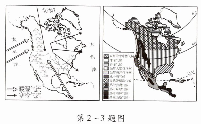 [2024.牡丹区模拟]地形是影响气候的重要因素之一,对气候类型的形成、分布和特点都有重要影响。读北美洲地形对气候的影响和北美洲气候类型分布示意图,完成2~3题。