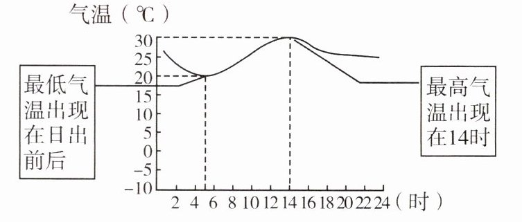 气温日较差=日最高气温−日最低气温。图中气温日较差约为:30℃−20℃=10℃。