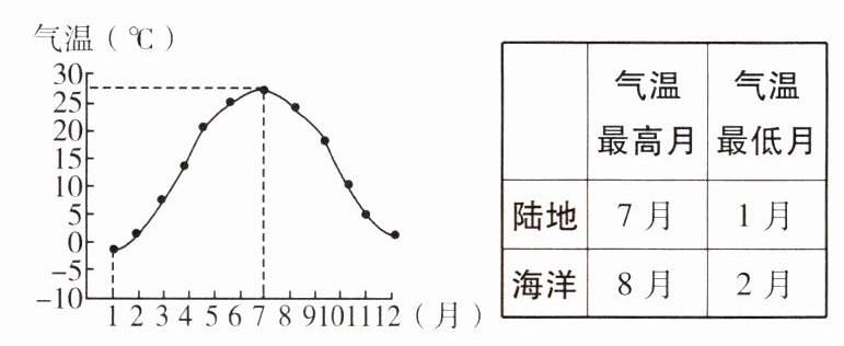 气温年较差=最热月平均气温−最冷月平均气温。图中气温年较差约为:27℃−(−2℃)=29℃。同纬度地区,气温年较差内陆大于沿海。