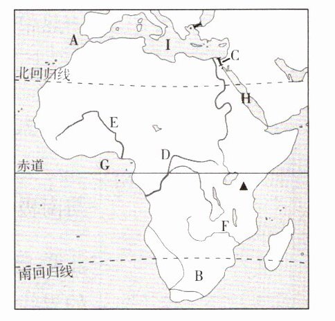 (3)海陆位置:北隔I________、A________与欧洲相望,东北隔H________、C________与亚洲相邻,东临印度洋,西临大西洋。