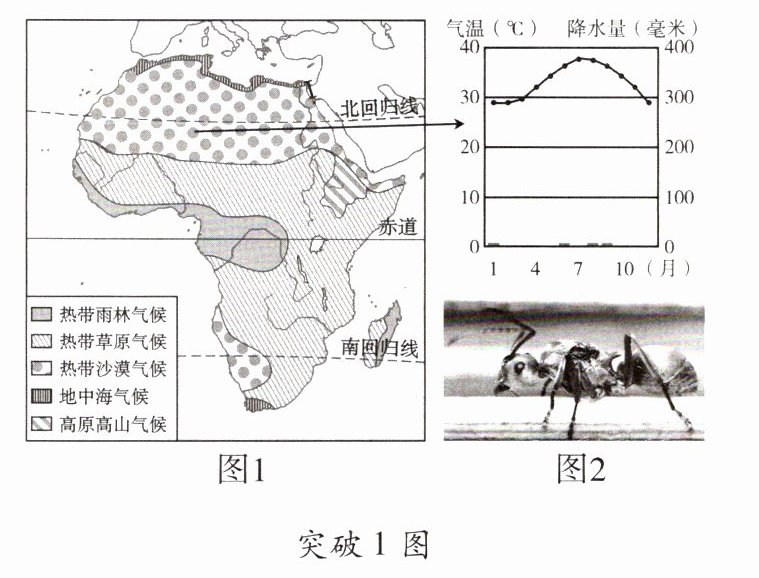 突破1 [2024·广东]银蚁生活在非洲撒哈拉沙漠,其生存绝技是以0.855米/秒的速度在高温天气出巢觅食,被称为“快银”。图1为非洲气候类型分布图,图2为银蚁分布地区气候资料及银蚁外观图。读图,完成1~3题。