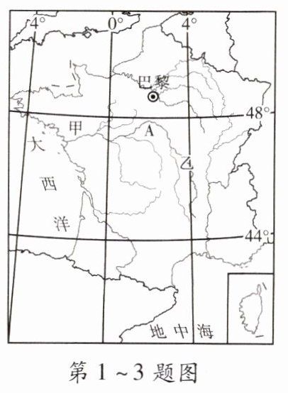 [2024.郓城期末]法国总统马克龙于2023年4月5日至7日对中国进行国事访问,法国60多位大企业负责人、20多位文化界人士等随团访问。随访的大企业负责人有法国葡萄酒厂商。如图为法国区域图,读图,完成1~3题。
