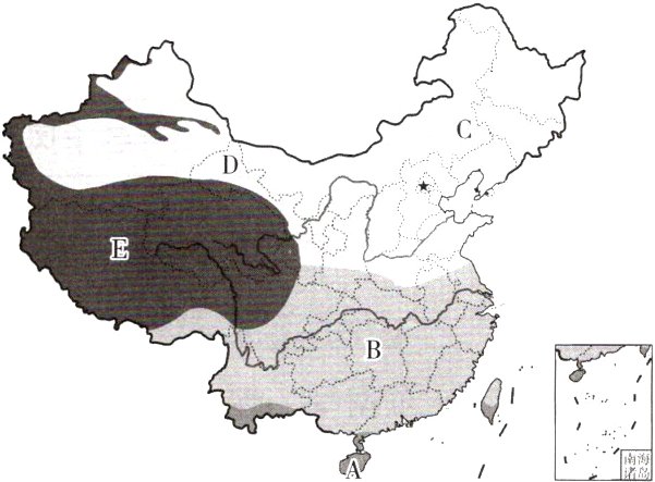 (1)气候类型:中国东半部有大范围的季风气候,自南向北依次为A________________气候、B______________气候、C______________气候;西北部大多为D____________________气候;青藏高原为独特的E________________气候。