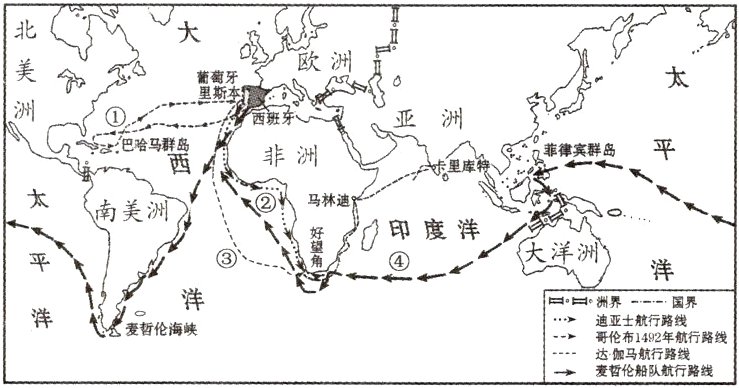 D 据题干“地圆学说”和所学知识可知,麦哲伦的船队从西班牙出发,穿越大西洋、太平洋和印度洋,最终返回欧洲,麦哲伦的船队第一次完成了环球航行,证实了“地圆学说”的正确,④符合题意。