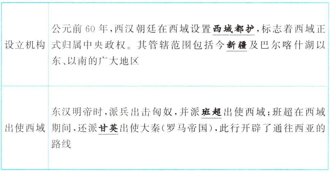 ②路线:长安→河西走廊→西域→中亚、西亚→欧洲(大秦)。