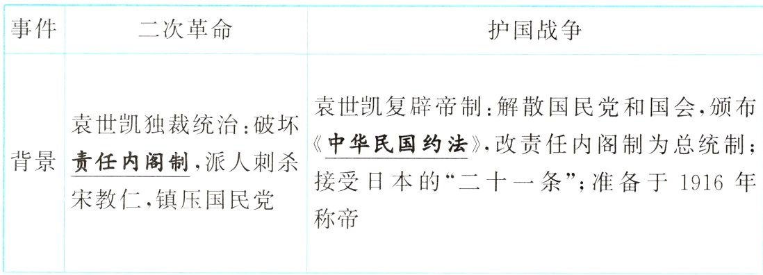 背景 袁世凯独裁统治:破坏责任内阁制,派人刺杀宋教仁,镇压国民党 袁世凯复辟帝制:解散国民党和国会,颁布《中华民国约法》,改责任内阁制为总统制;接受日本的“二十一条”;准备于1916年称帝
