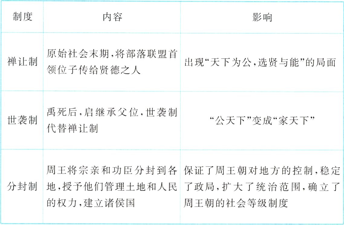 |分封制|周王将宗亲和功臣分封到各地,授予他们管理土地和人民的权力,建立诸侯国|保证了周王朝对地方的控制,稳定了政局,扩大了统治范围,确立了周王朝的社会等级制度|