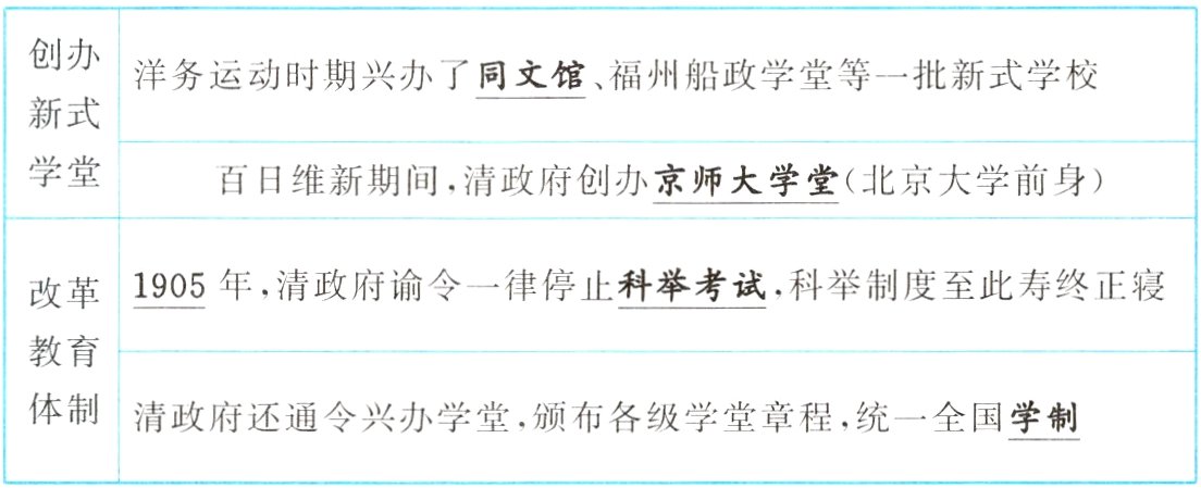 |创办新式学堂|洋务运动时期兴办了同文馆、福州船政学堂等一批新式学校;百日维新期间,清政府创办京师大学堂(北京大学前身)|