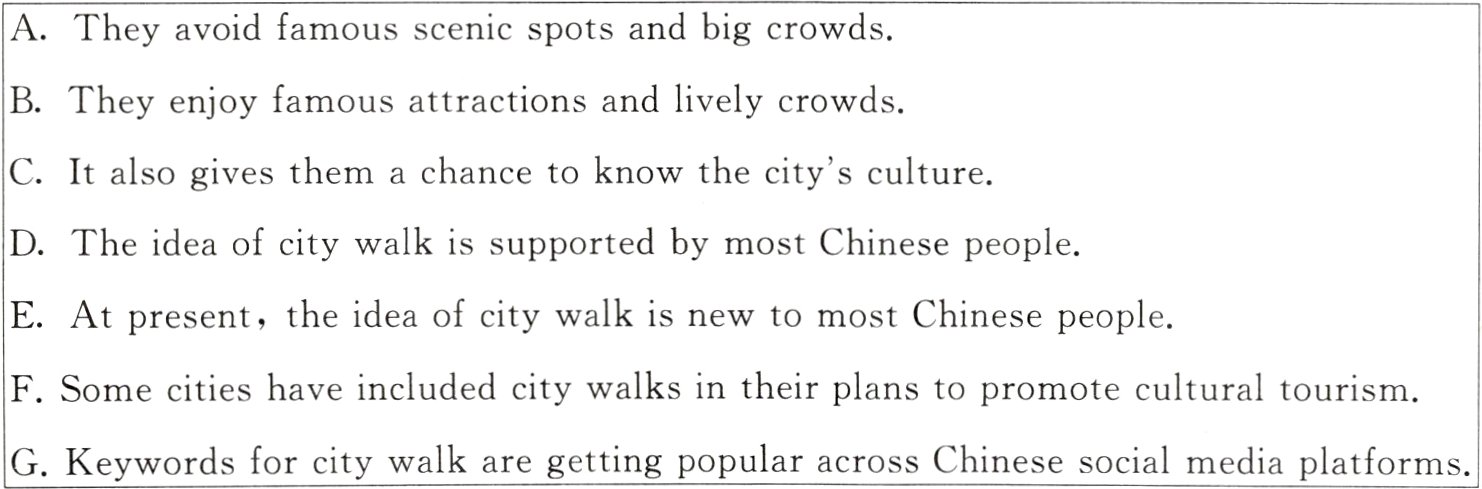 What makes a city walk? To them, it means “roaming(漫步) around the city” on foot. 1 Instead, they often explore old buildings or small shops and enjoy a cup of coffee or local snacks.
