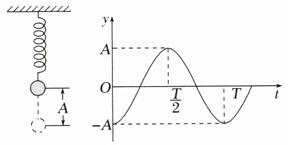 2. [2021·广东卷,16(1)]如图所示,一个轻质弹簧下端挂一小球,小球静止。现将小球向下拉动距离$A$后由静止释放,并开始计时,小球在竖直方向做简谐运动,周期为$T$。经$\frac{T}{8}$时间,小球从最低点向上运动的距离______$\frac{A}{2}$(填“大于”“小于”或“等于”);在$\frac{T}{4}$时刻,小球的动能______(填“最大”或“最小”)。