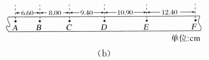(1)由题图(b)中纸带的相关数据可知$\Delta x_{AD}=6.60\text{ cm}+8.00\text{ cm}+9.40\text{ cm}=24.00\text{ cm}$,由平均速度的定义可知$\overline{v}_{AD}=\frac{\Delta x_{AD}}{3T}=\frac{24.00}{0.3}\text{ cm/s}=80.0\text{ cm/s}$。