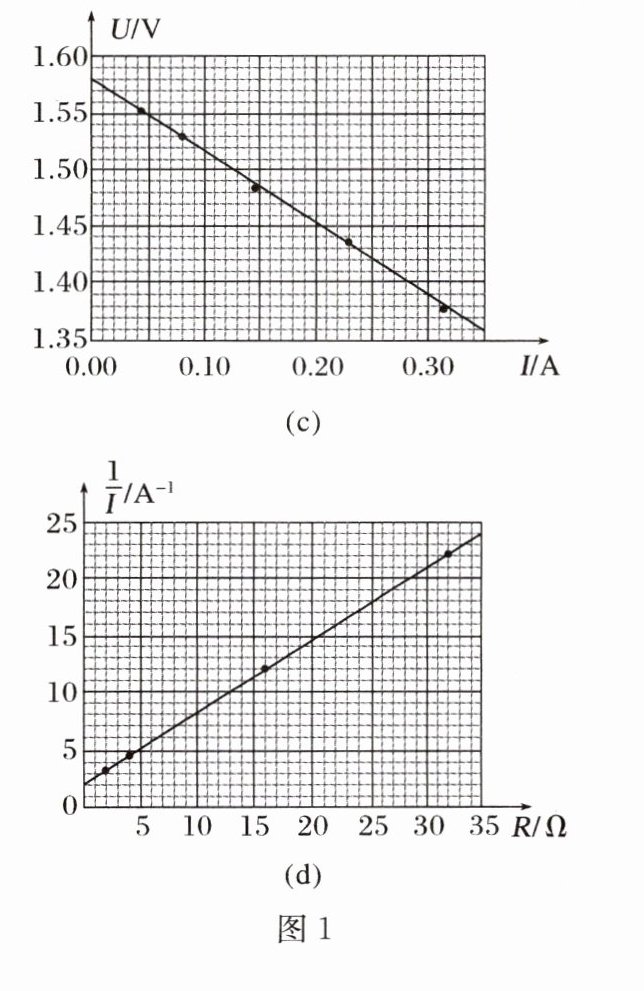 (2)调节电阻箱到最大阻值,闭合开关。逐次改变电阻箱的电阻,记录其阻值R、相应的电流表示数I和电压表示数U。根据记录数据作出的U - I图像如图(c)所示,则干电池的电动势为______V(保留3位有效数字)、内阻为______Ω(保留2位有效数字)。