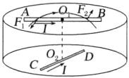 如图8所示,一光滑绝缘的圆柱体固定在水平面上。导体棒$AB$可绕过其中点的转轴在圆柱体的上表面内自由转动,导体棒$CD$固定在圆柱体的下底面。开始时,两棒相互垂直并静止,两棒中点$O_1$、$O_2$连线与圆柱体的中轴线重合。现对两棒同时通入图示方向($A$到$B$、$C$到$D$)的电流。下列说法正确的是 ( )