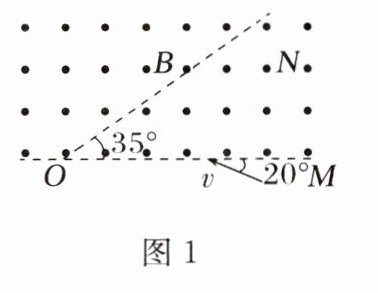 例1(多选)平面OM和平面ON之间的夹角为35°,其横截面(纸面)如图1所示,平面OM上方存在匀强磁场,大小为B,方向垂直于纸面向外。一质量为m,电荷量绝对值为q、电性未知的带电粒子从OM上的某点向左上方射入磁场,速度与OM成20°角,运动一会儿后从OM上另一点射出磁场。不计重力。则下列几种情形可能出现的是( )
