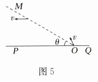 例4(2024·辽宁大连高三期末)如图5所示,虚线MO与水平线PQ相交于点O,二者夹角θ = 30°,在MO右侧区域存在一矩形匀强磁场(图中未画出),磁感应强度大小为B、方向垂直纸面向里,MO为磁场的一条边界线。现有质量为m、电荷量为q的带正电粒子在纸面内沿某一方向以速度v从O点射入磁场,粒子从边界线MO射出时,速度方向平行于PQ向左。不计粒子的重力和粒子间的相互作用力,求: