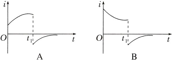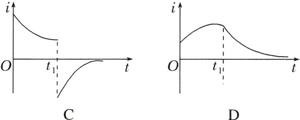 4. 用电流传感器(电流传感器相当于电流表,其电阻可以忽略不计)研究自感现象的实验电路如图9所示,电源的电动势为$E$,内阻为$r$,自感线圈$L$的自感系数足够大,其直流电阻值大于灯泡D的阻值,在$t = 0$时刻闭合开关S,经过一段时间后,在$t = t_1$时刻断开开关S。下列关于灯泡D中的电流随时间变化情况的图像可能正确的是( )